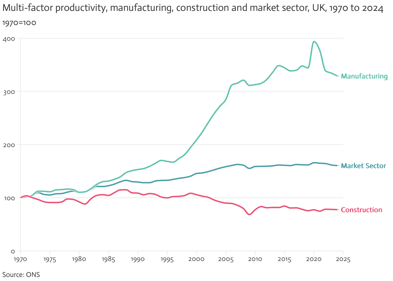 The government acknowledges that its delivery record is weak - UK infrastructure projects take 16.2 years on average, some 25% longer than elsewhere - and are aiming to close this gap by tackling blockers such as planning delays, regulatory bottlenecks and a lack of strategic direction. But these fixes stop short of the more fundamental constraint: stagnant construction productivity.