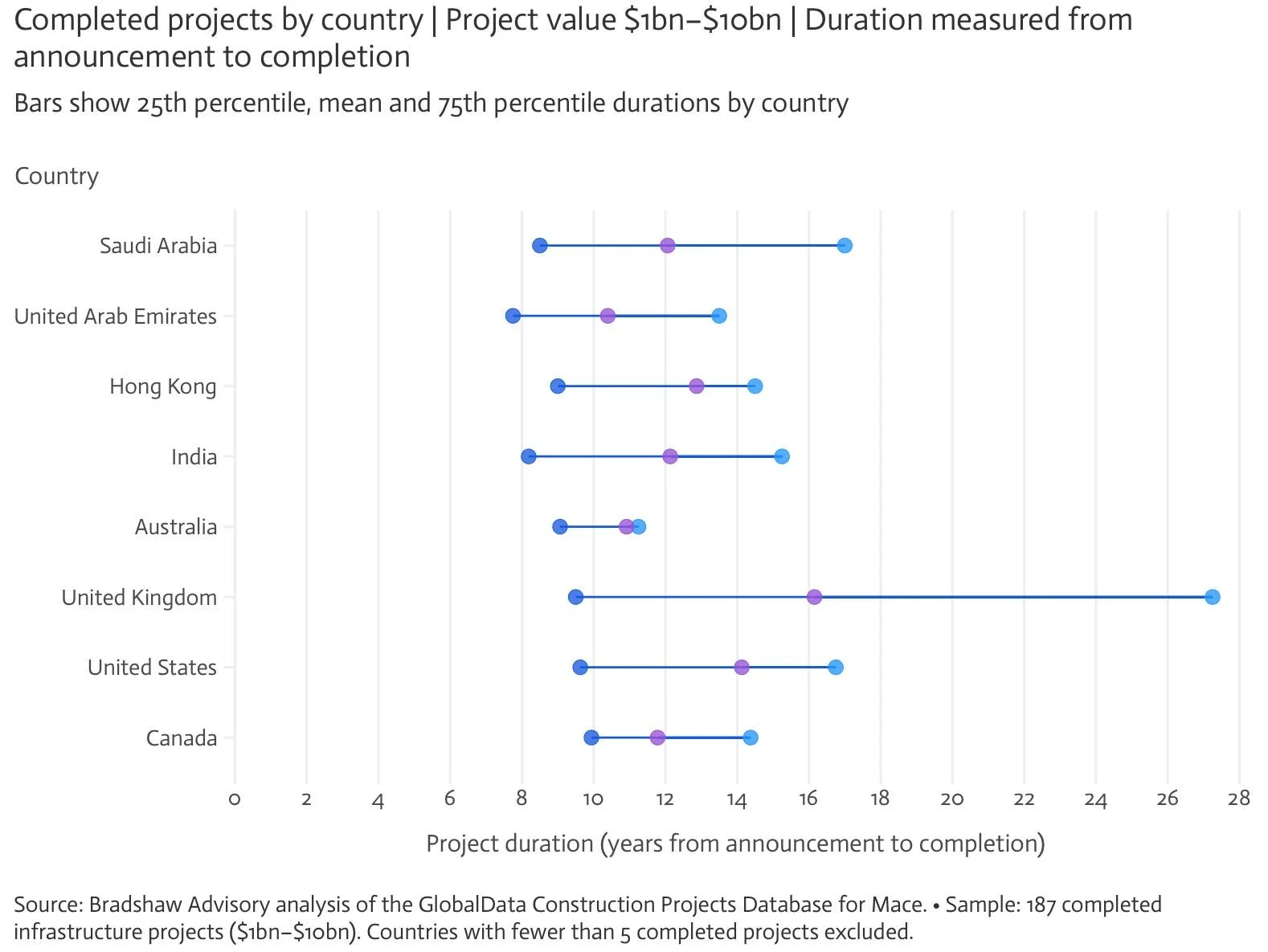 With few exceptions, construction productivity is an issue everywhere - rising just 0.4% annually (global aggregate, output-weighted) between 2000 and 2022 compared with 2% for the wider economy. This international drag cannot explain the UK’s specific failings - UK infrastructure projects taking 25% longer than average - but it does set a ceiling. Unless productivity improves, the gains from planning reform or regulatory streamlining will be capped.